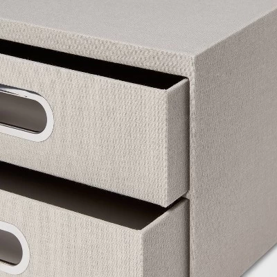Bring a stylish storage option to your workspace with this Canvas Paper Drawers from Brightroom™. This compact canvas drawer brings clutter-free organization to your space. It features two drawers and a top compartment to place your stationery, books, notepads, accessories and more. The cutout handles with a chic metal rim detail make it easy to pull-them out, and coordinates well with any interior decor.